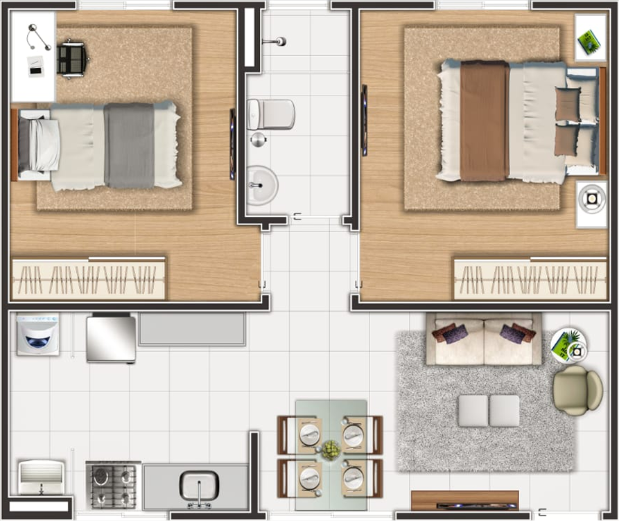 Com 50m² bem distribuídos, o layout integra os ambientes e cria uma sensação de amplitude, aproveitando cada metro com eficiência.